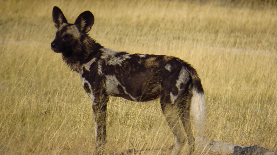 22.8. Nun geht es von der River Front in den hügeligen, trockenen Teil des Chobe Nationalparks. Wir fahren auf den Savuti Campsite. Hier muss man die Tiere mehr suchen gehen als an der River Front, mit Glück erspäht man am Leopard Rock tatsächlich eine Leopardin (sie wird relativ oft dort gesehen) oder findet Wildhunde ganz am frühen Morgen am Wasserloch. An einem Hügel kann man nach kurzen Fussmarsch uralte Wandmalereien entdecken und für den Sundowner empfiehlt sich ein großer Baobab.
