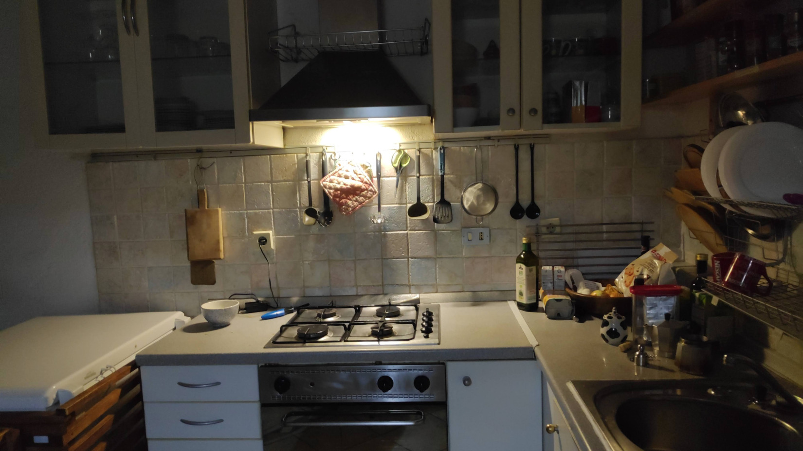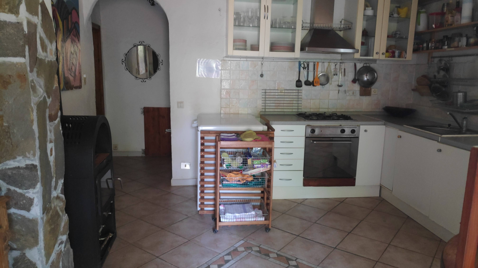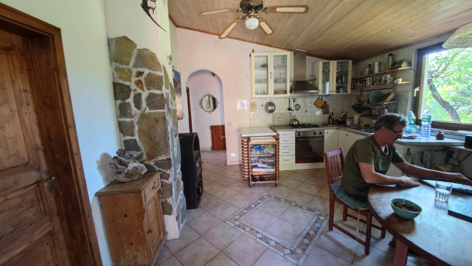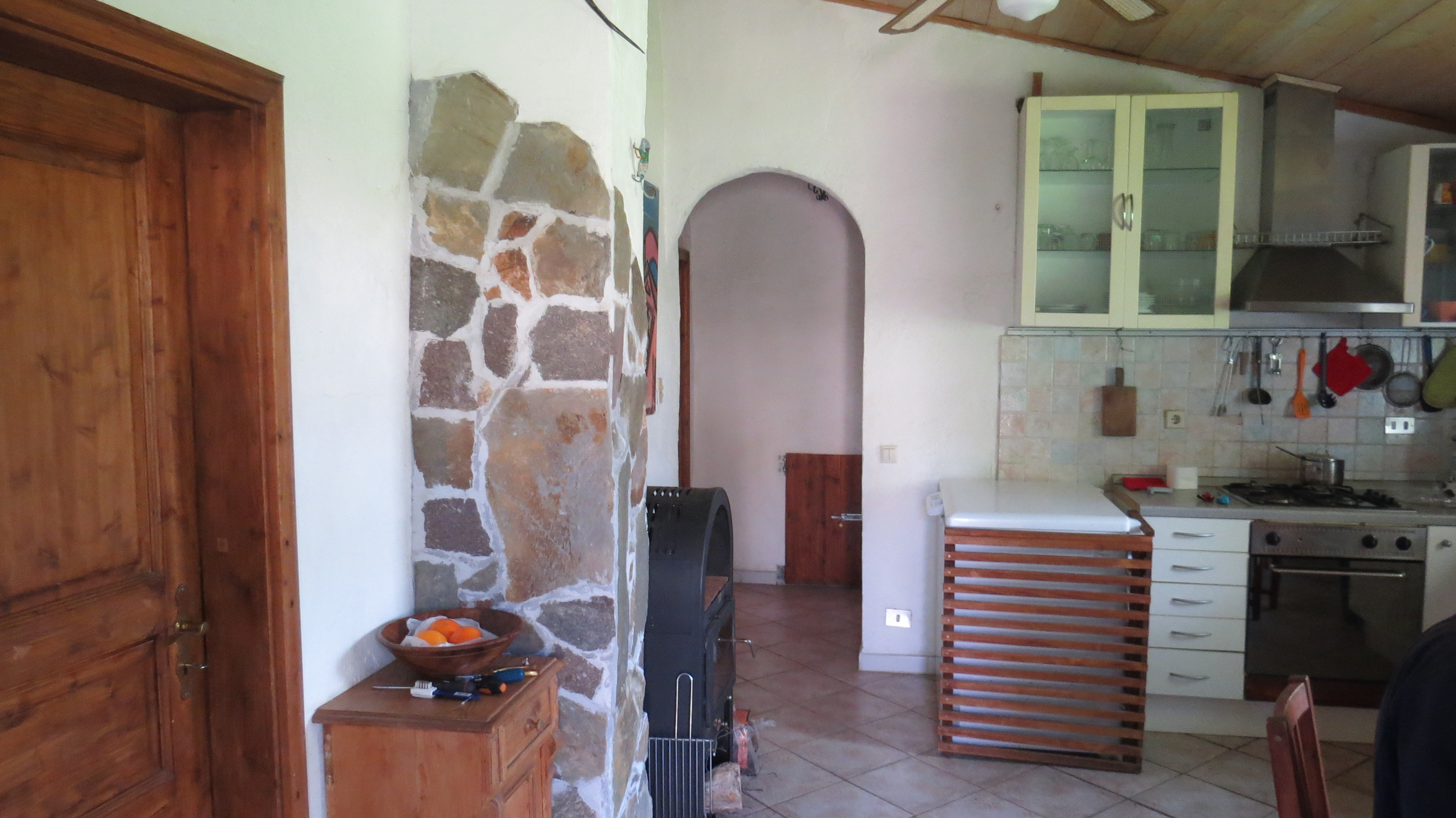 Die Küche ist 20 qm groß und bietet einen Gasherd und einen 240 l Solarkühlschrank. Sie ist reichlich mit Geschirr, Gläsern und Kochutensielien ausgestattet. Für die Übergangszeit gibt es einen Schwedenofen, der mit Holzbriguettes beheizt, ein warmes und gemütliches Feuer erzeugt. Der Küchentisch ist ausziehbar und somit bis zu sechs Erwachsenen bzw sieben Personen, wenn man ein Kleinkind noch dabei hat (es gibt einen Kinderhochstuhl für Kleinkinder) nutzbar. Im Normalfall ist der Tisch für vier Personen hergerichtet, so dass man gut Platz in der Küche zum Kochen, essen und spielen findet. Beide Fenster können mit einem Laden verschlossen werden. Das rechte Fenster hat zudem ein Stahlmoskitonetz, so dass es auch geöffnet werden kann und Fliegen bzw. Mücken draußen bleiben.